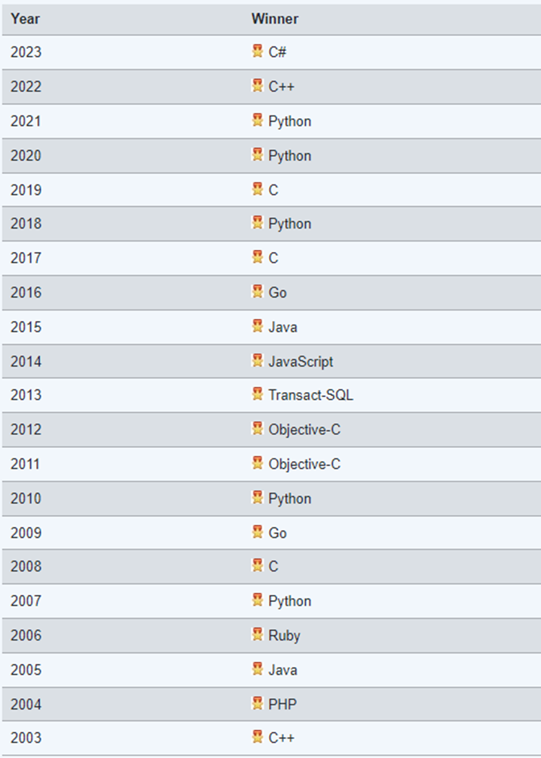 "올해의 프로그래밍 언어" 수상자를 모두 나열한 명예의 전당은 아래와 같습니다. 이 상은 한 해 동안 가장 높은 평점 상승을 보인 프로그래밍 언어에 수여됩니다.