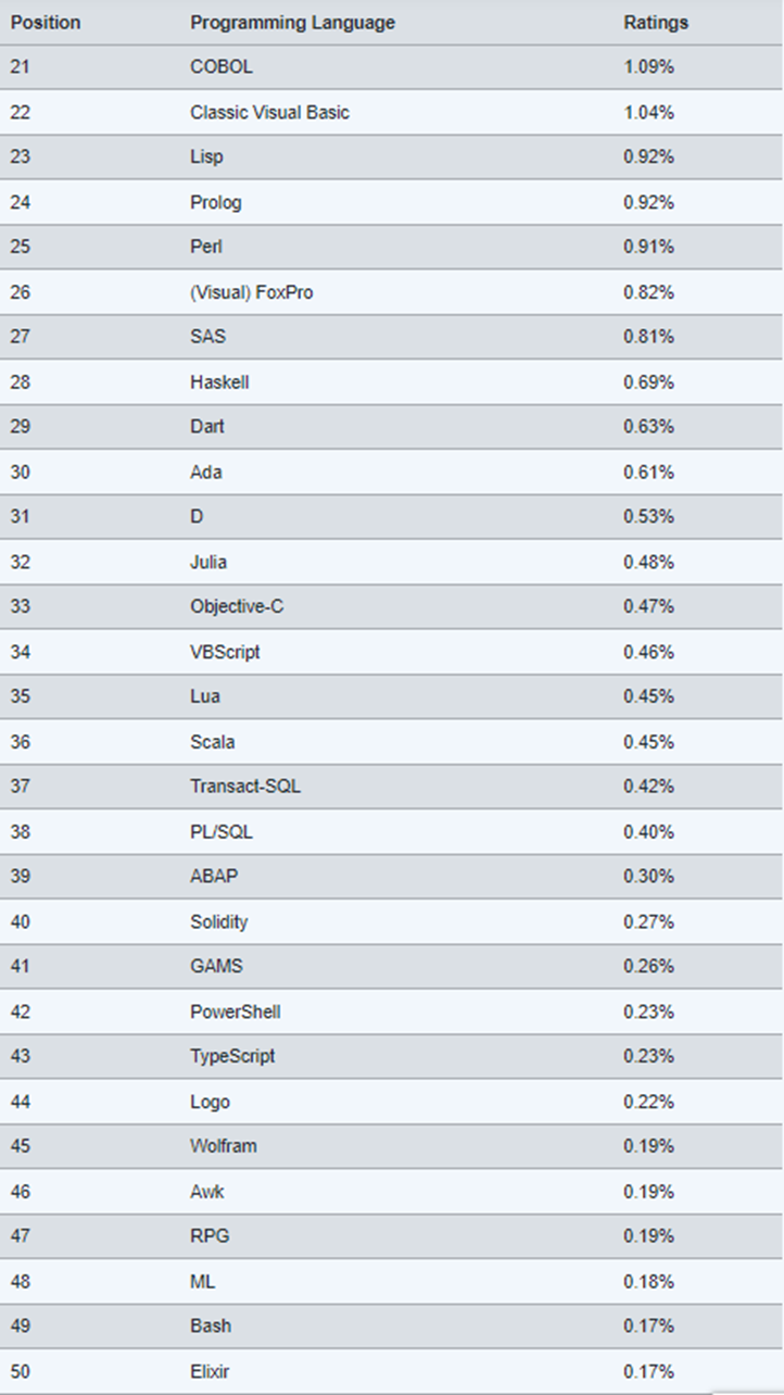 프로그래밍 언어의 전체 상위 50개 목록은 다음과 같습니다. 이 개요는 언어가 누락된 경우가 있을 수 있으므로 비공식적으로 게시됩니다. 프로그래밍 언어가 부족하다고 생각되면 tpci@tiobe.com으로 알려주시기 바랍니다. 또한 우리가 모니터링하는 모든 프로그래밍 언어의 개요를 확인하십시오.