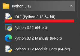 설치된 메뉴 항목에서 "IDLE (Python 3.12 64-bit)" 항목을 선택합니다.