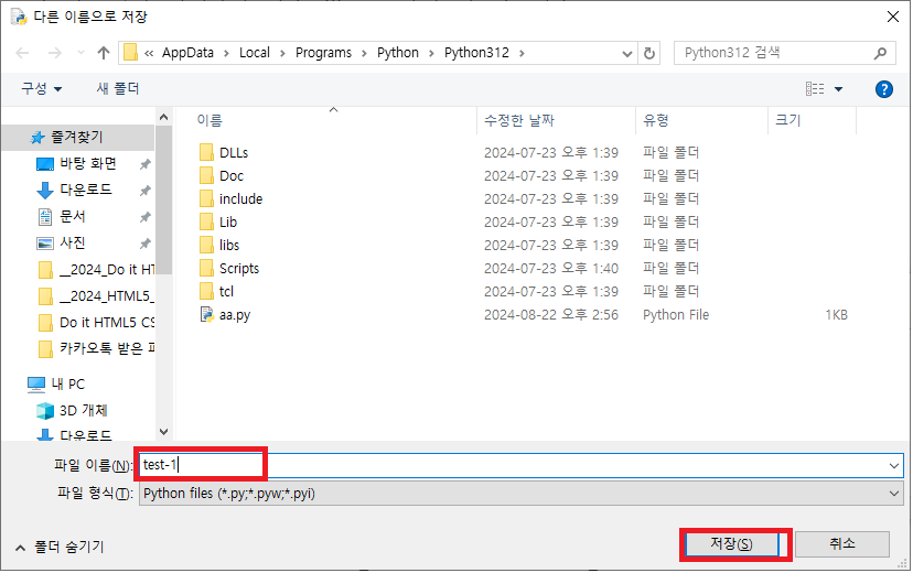 저장하기 전에 저장할 위치를 변경할 수 있으며, 파이썬 소스 파일은 확장자가 ".py"입니다. 예를 들어, "test-1"로 저장하면 "test-1.py"로 저장됩니다.