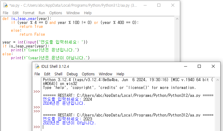 파이썬에서 윤년을 구하는 코드는 다음과 같습니다.