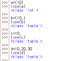 | a=10 # int 자료형 b=(10) # int 자료형 c=(10,) # tuple d=10, # tuple e=10,20,30 #tuple f=() #tuple |