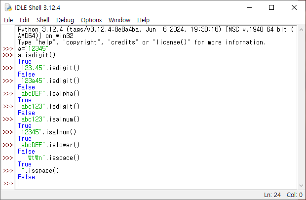 - 공백, 숫자, 기호 등이 포함되어 있으면 False를 반환합니다.
