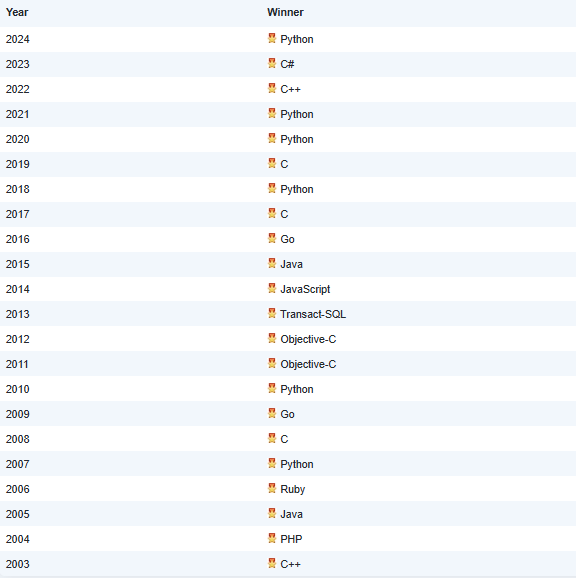 "올해의 프로그래밍 언어" 수상자를 모두 나열한 명예의 전당은 아래와 같습니다. 이 상은 1년 동안 평가가 가장 많이 상승한 프로그래밍 언어에 수여됩니다.
