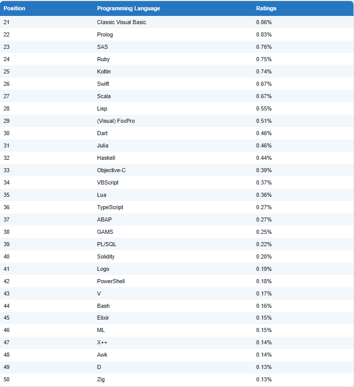 Kotlin, Ruby, Swift는 최근까지 TIOBE 지수에서 상위 20위권을 매우 안정적으로 유지해 왔습니다. 하지만 이제는 그 영향력을 잃고 유행에서 뒤처질 가능성이 높습니다. Kotlin과 Swift가 쇠퇴하는 이유는 동일합니다. 두 언어 모두 각각 특정 모바일 플랫폼인 Android와 iOS에서 주로 사용되는 반면, 최근에는 크로스 플랫폼 개발에 적합한 다른 훌륭한 언어와 프레임워크들이 많이 있습니다. Swift는 Android 개발에 사용할 수 있지만, 상당히 어렵습니다. 게다가 iOS에서는 Kotlin이 제대로 자리 잡지 못했습니다. Ruby는 또 다른 이야기입니다. Ruby는 오랫동안 Python, Perl과 경쟁해 왔습니다. Perl이 쇠퇴하는 동안 Ruby는 안정을 찾았습니다. 하지만 이제 Python이 프로그래밍 세계의 공용어가 되면서 Ruby가 설 자리는 거의 없습니다.