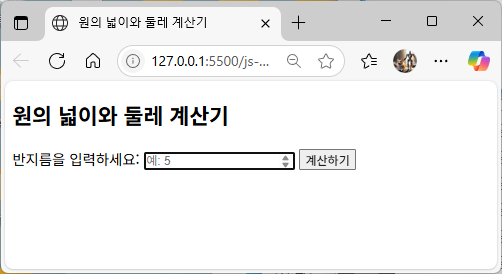 input 태그로 반지를을 입력받아, 원의 둘레와 넓이를 계산하는 자바스크립트 코드입니다.