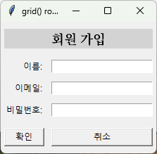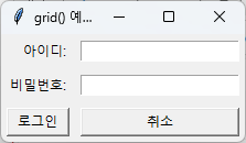 위젯.grid(row=행번호, column=열번호, 옵션...)