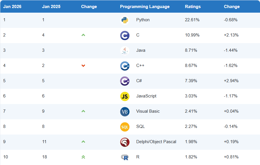 2025년 상위 10위권에도 흥미로운 변동이 있었습니다. C와 C++의 순위가 서로 바뀌었죠. C++는 그 어느 때보다 빠르게 발전하고 있지만, 모듈 개념과 같은 급진적인 변화들은 아직 업계에서 널리 채택되지 못하고 있습니다. 반면 C는 여전히 간단하고 빠르며, 점점 성장하는 소형 임베디드 시스템 시장에 매우 적합합니다. Rust조차도 이번 달 13위라는 최고 순위를 기록했음에도 불구하고 이 시장에 진입하는 데 어려움을 겪고 있습니다.