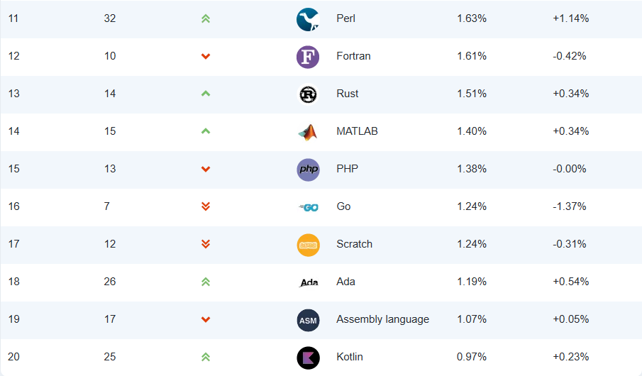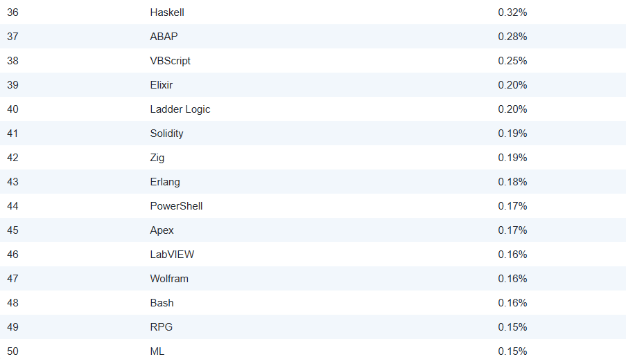 프로그래밍 언어 상위 50위 목록은 아래와 같습니다. 이 목록은 비공식적으로 게시된 것이므로 누락된 언어가 있을 수 있습니다. 누락된 프로그래밍 언어가 있다고 생각되시면 tpci@tiobe.com으로 알려주시기 바랍니다. 저희가 모니터링하는 모든 프로그래밍 언어 목록도 확인해 보세요.