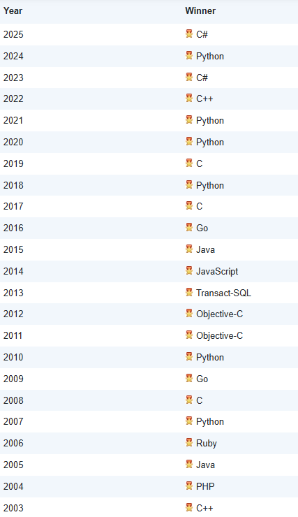 아래는 "올해의 프로그래밍 언어" 수상작 목록입니다. 이 상은 한 해 동안 평점 상승률이 가장 높은 프로그래밍 언어에 수여됩니다.