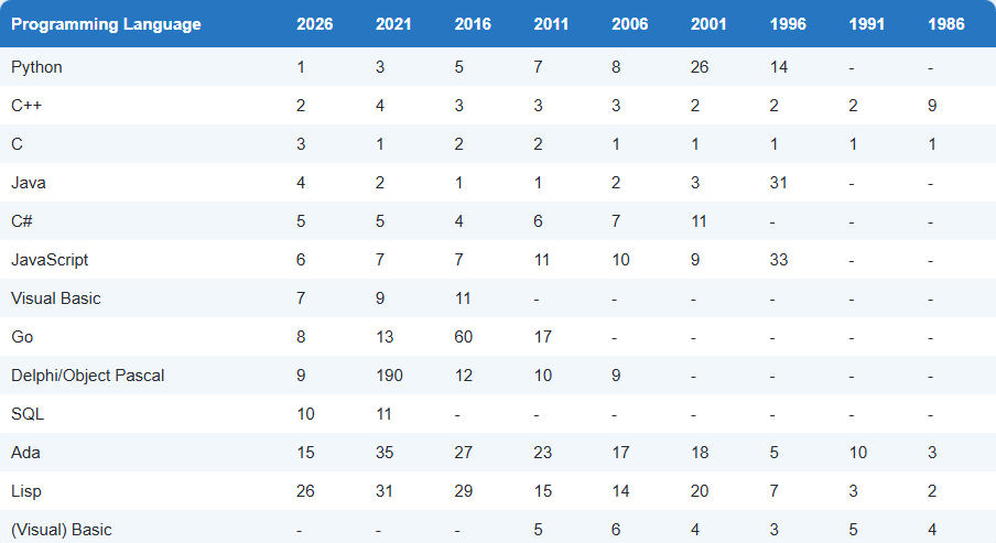 | 2025년 11월 프로그래밍 언어 인기 순위, TIOBE INDEX (0) | 2025.12.02 |