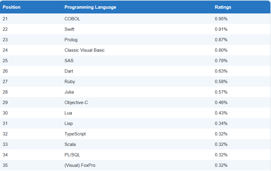 물론 승자가 있는 곳에는 패자가 있기 마련입니다. Go는 2025년에는 10위권 밖으로 밀려난 것으로 보입니다. Ruby 역시 20위권 밖으로 떨어졌고, 당분간 다시 복귀하기는 어려워 보입니다.
