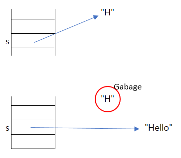 위 코드는 처음에 "H"가 할당된 메모리의 크기가 변경되는 것이 아니라, 다른 위치에 "Hello" 라는 메모리를 할당받고, 참조 s가 변경된 메모리의 위치를 참조하게 됩니다. 이 때 기존에 할당된 "H"의 메모리는 사용할 수 없게되며, 사용하지 않는 메모리는 GC(Garbage Collector. 가비지 콜렉터)가 수거해 갑니다.