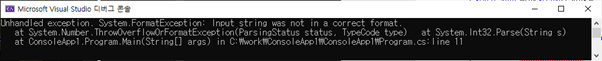 | Unhandled exception. System.FormatException: Input string was not in a correct format. at System.Number.ThrowOverflowOrFormatException(ParsingStatus status, TypeCode type) at System.Int32.Parse(String s) at ConsoleApp1.Program.Main(String[] args) in C:\work\ConsoleApp1\ConsoleApp1\Program.cs:line 11 |