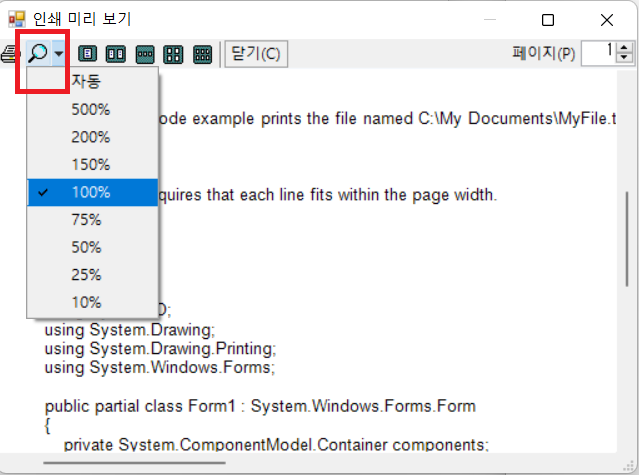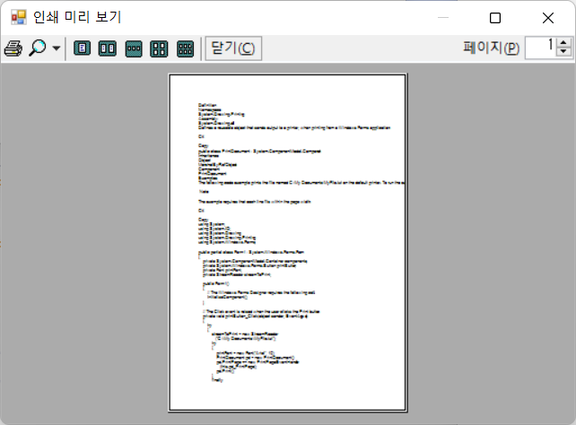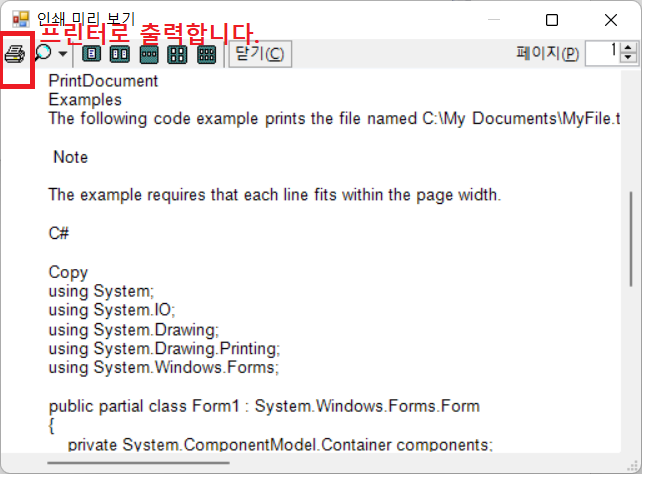 버튼 1개, PrintDocument 1개, PrintPreview 1개