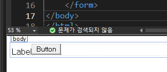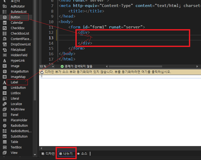 HTML의 <div> 태그 사이에 마우스 포인터를 위치시키고, "Label"과 "Button"를 더블 클릭해서 가져옵니다.