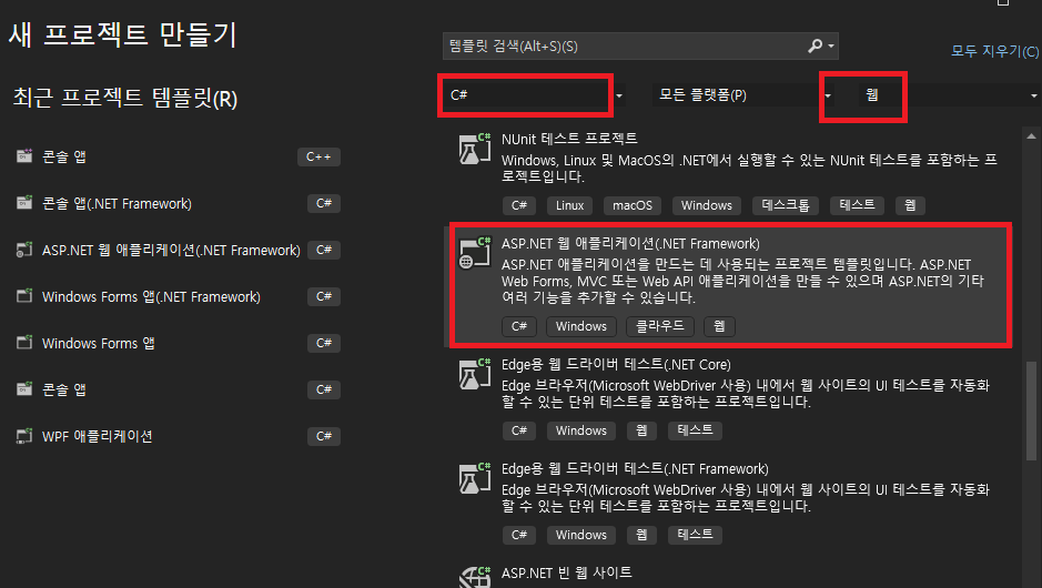 2. 새 프로젝트 만들기에서 "ASP.NET 웹 애플리케이션(.NET Framework)"를 선택합니다.