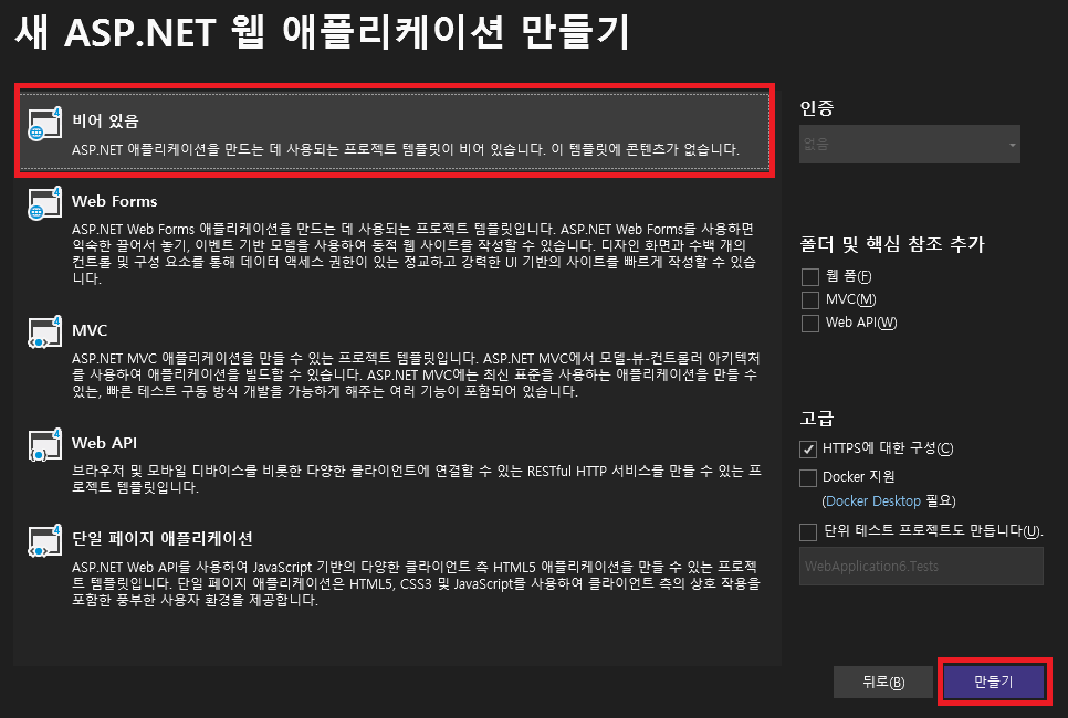 3. [새 ASP.NET 웹 애플리케이션 만들기]에서 "비어 있음"을 선택하고, [만들기] 버튼을 누릅니다.