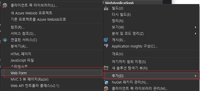 프로젝트 위에서 마우스 오른쪽 버튼을 누르고, 추가 --> "Web Form"을 선택합니다.
