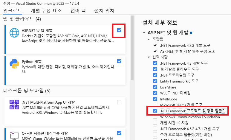 2. "ASP.NET 및 웹 개발"을 체크하고, 설치 세부 정보에서 ".NET Framework 프로젝트 및 항목 템플릿"도 선택합니다.