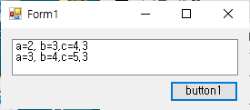 listBox1.Items.Add(String.Format("a={0}, b={1},c={2}", a, b, c));