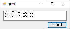 listBox1.Items.Add("이름:" + name + ", 나이:" + age);