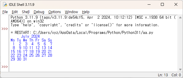 2024년 7월, 한 달의 달력만 출력하기 위해서는 다음과 같이 코드를 작성하면 됩니다.