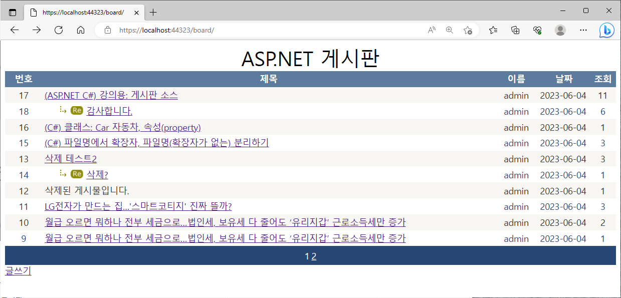(ASP.NET C#) (강의용) 게시판 소스 수업시간에 코드를 복사하여 사용하기 위해서 텍스트 소스로 등록합니다. 모든 게시판 프로그램은 ~/Board 폴더로 링크되어 있습니다. 데이터베이스: (LocalDB, MS SQL Server) 데이터베이스를 다루는 클래스: https://coding-abc.kr/19 게시판 목록 글 쓰기 글 읽기 답변글 쓰기 C#_ASP.NET 2023.06.04
