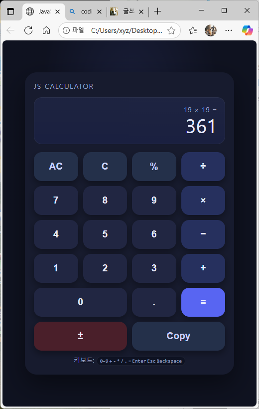자바스크립트로 만든 계산기입니다.아래와 같은 기능을 가지고 있습니다. 사칙연산, 소수점, 퍼센트(일반 공학계산기 방식), 부호 전환(±)연속 계산(= 후 바로 이어서 연산 가능)AC(전체 초기화), C(한 글자 삭제), 복사 버튼(결과 클립보드 복사)키보드 입력 지원: 숫자/+, -, *, /, ., =, Enter, Esc, Backspace, % JS Calculator 0 AC C % ÷ 7 8 9 × 4 5 6 − 1 2 3 + 0 . = ..