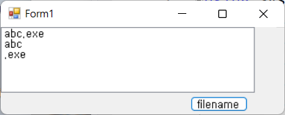 다음 코드는 파일명에서 확장자를 분리하는 코드입니다. 확장자와 확장자를 제거한 파일명을 출력합니다. GetExtention() 메서드는 확장명에 점(.)까지 포함하고 있기 때문에 다시 결합할 때 점은 결합할 필요가 없습니다. string file = Path.GetFileNameWithoutExtension(filename); string ext = Path.GetExtension(filename); using System.IO; private void button2_Click(object sender, EventArgs e) { string filename = "abc.exe"; string file = Path.GetFileNameWithoutExtension(filename); string ext ..