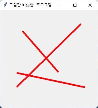 (강의용) 복사하여 사용하기 위한 코드입니다. 마우스로 그림을 선을 그리는 파이썬 코드입니다. from tkinter import * ## 변수 ## window=None canvas=None x1, y1, x2, y2 = None, None, None, None # 선의 시작점과 끝점 ## 함수 ## def mouseClick(event): global x1, y1, x2, y2 x1=event.x y1=event.y def mouseDrop(event): global x1, y1, x2, y2 x2=event.x y2=event.y canvas.create_line(x1, y1, x2, y2,width=5, fill="red") ## 메인 코드 ## window=Tk() window.title("그림..