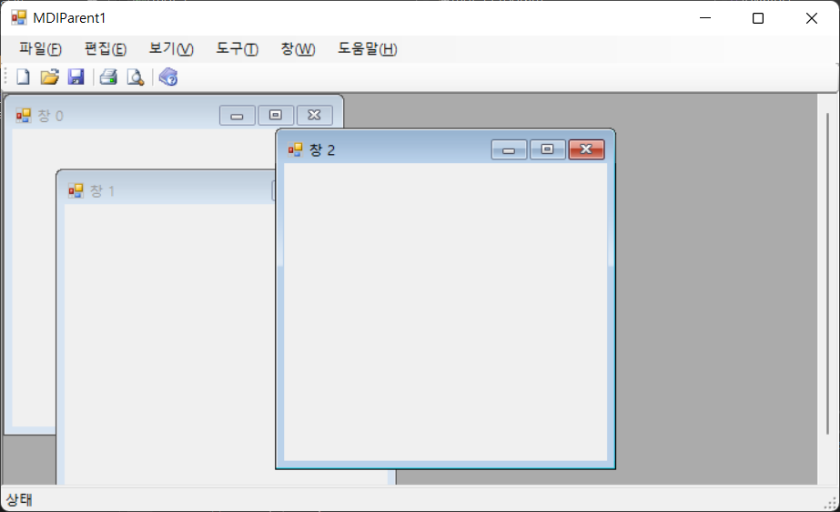 MDI는 한 개의 부모폼 안에 한 개 또는 여러 개의 자식 폼을 포함하는 형태의 인터페이스를 말합니다. C# 언어에서는 폼을 추가할 때 "MDI 부모 양식"을 선택하거나 일반 폼의 IsMdiContainet 속성을 "true"로 변경해서 MDI 폼을 만들 수 있습니다. 1. "MDI 부모 양식(Windows Forms)"으로 만들기 솔루션탐색기의 프로젝트 위에서 추가 → 새 항목 → "MDI 부모 양식" 선택 MDI폼이 먼저 시작되도록 변경합니다. static void Main() { Application.EnableVisualStyles(); Application.SetCompatibleTextRenderingDefault(false); Application.Run(new MDIParent1()); }..