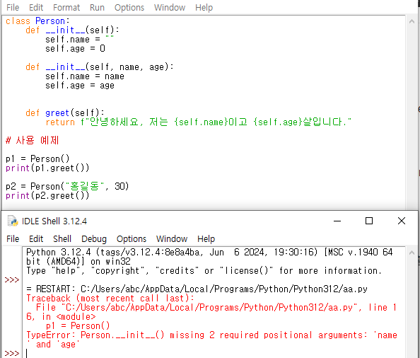 파이썬 클래스에 대해 알아 보겠습니다.여기서는 이해를 쉽게하기 위해서 사람(Person)의 이름과 나이를 표현해 봅니다.class Person: def __init__(self, name, age): self.name = name self.age = age def greet(self): return f"안녕하세요, 저는 {self.name}이고 {self.age}살입니다."# 사용 예제person1 = Person("홍길동", 30)print(person1.greet())코드 설명__init__ 메서드:클래스를 초기화하는 생성자 메서드입니다.name과 age를 매개변수로 받아 self.name과 self.age에 저장합니다.greet 메서드:사람 객체의 이..