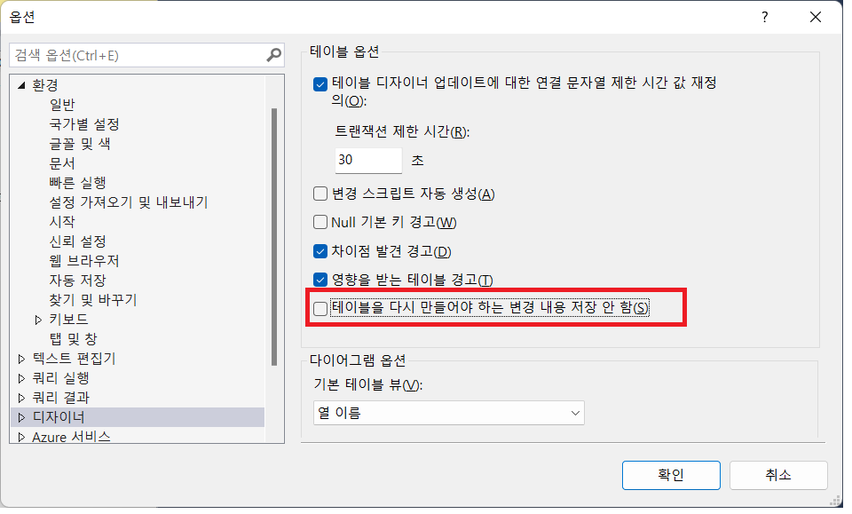 디자인 도구에서 테이블 구조를 변경하고 저장하면 출력되는 메시지입니다. "변경 내용을 저장할 수 없습니다. 변경 내용을 적용하려면 다음 테이블을 삭제하고 다시 만들어야 합니다. 다시 만들 수 없는 테이블을 변경했거나 [테이블을 다시 만들어야 하는 변경 내용 저장 사용 안 함] 옵션을 설정했습니다." 테이블을 삭제하고 다시 만들수 없을 때, 위 옵션을 변경하면 됩니다. -- [테이블을 다시 만들어야 하는 변경 내용 저장 사용 안 함] 옵션을 설정했습니다. 해결 방법 1. [도구] 메뉴에서 옵션을 선택합니다. 2. [옵션] 창에서 "디자이너"를 선택합니다. 3. "테이블을 다시 만들어야 하는 변경 내용 저장 안 함" -- 이 항목의 체크 표시를 해제합니다. 4. [확인] 버튼을 누릅니다.