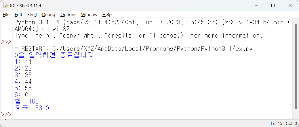 키보드에서 값(정수)를 입력받아 합과 평균을 구하는 파이썬 프로그램입니다. 0을 입력하면 입력을 종료하고, 합과 평균을 구해서 출력합니다. sum=0 cnt=0 print('0을 입력하면 종료합니다.') while True: n = int(input('%d: ' % (cnt+1))) if n ==0: break sum += n cnt += 1 print('합: %d' % sum) print('평균: ', end='') print(sum/cnt)