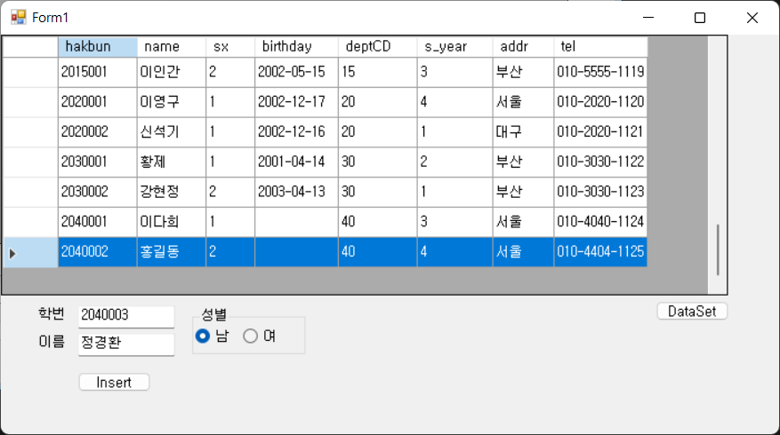 SQL Server 또는 LocalDB에 데이터를 insert 하는 C# 코드입니다. using System; using System.Windows.Forms; using System.Data.SqlClient; using System.Data; ... string connectionString = @"Server=(LocalDB)\MSSQLLocalDb;database=haksa;integrated security=true"; ... private void btnInsert_Click(object sender, EventArgs e) { // 데이터베이스 student 테이블에 insert if(txtHakbun.Text.Trim().Length!=7) { MessageBox.Show("학번은 7자리입..