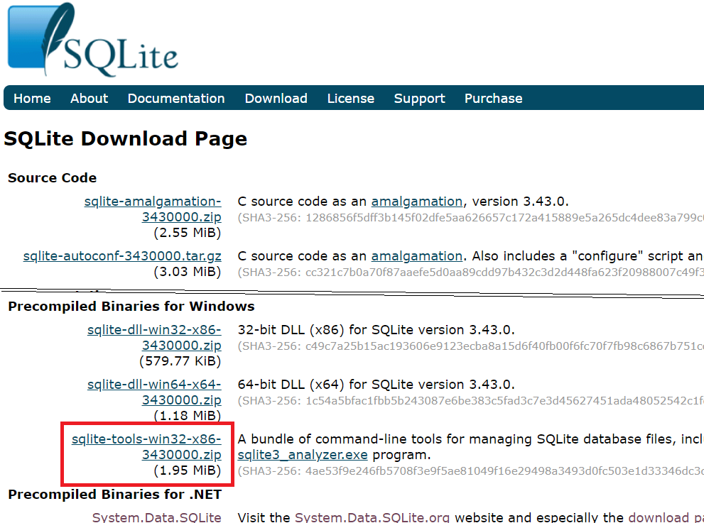 여기서는 윈도우용 SQLite를 다운로드 받아 설치합니다. 1. SQLite 다운로드아래의 링크를 클릭합니다.https://sqlite.org/download.html 2. 아래 그림에 표시된 윈도우용 "sqlite-tools-win32-x86....zip" 파일을 선택하면 다운로드를 시작합니다. 3. 다운로드 받은 파일의 압축을 풀고, 폴더를 "c:\sqlite"로 이동하겠습니다.폴더를 c:\로 이동한 다음에 이름 바꾸기에서 "sqlite"로 변경합니다. 4. "sqlite3.exe"를 더블 클릭해서 실행합니다. 5. 데이터베이스를 생성합니다 - 여기서는 "haksa" 데이터베이스를 만들겠습니다.".open 데이터베이스명"을 입력하면 데이터베이스를 새로 생성하거나 이미 존재하면 데이터베이스를 엽니다...