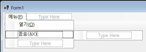 메뉴 만들기 C#에서 메뉴와 관련된 도구 상자에는 다음과 같은 것들이 있습니다. - ContextMenuStrip - MenuStrip - StatusStrip - ToolStrip - ToolStripContainer 메뉴 및 도구 모음 C#에서 메뉴 만드는 방법을 설명합니다. - Windows Forms 앱 (.NET 6.0) - Windows Forms 앱(.NET Framework) 예제 1. 프로젝트를 생성합니다. 여기서는 Windows Forms 앱 (.NET 6.0), 비주얼스튜디오 2022 버전을 사용합니다. [메뉴및 도구 모음]에서 다음 컨트롤을 추가합니다. - MenuStrip과 ToolStrip을 더블 클릭해서 폼에 추가합니다. - MenuStrip을 다음과 같이 입력합니다. -- 메..