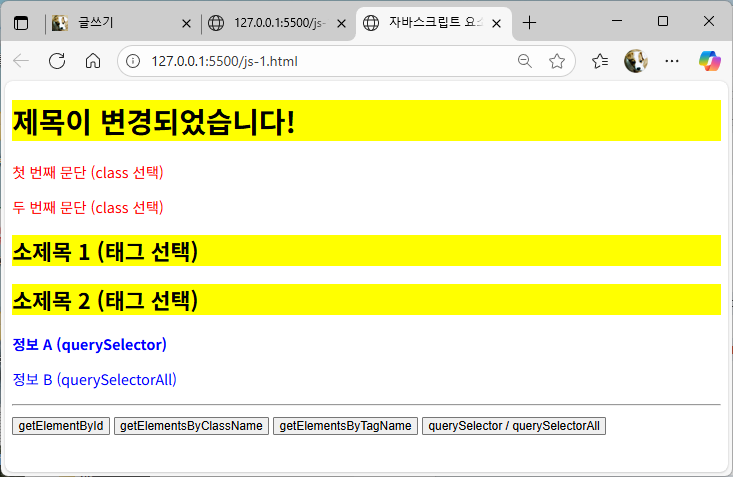 바스크립트에서 요소(element) 선택은 HTML 문서 안의 특정 태그를 가져와서 조작할 수 있게 해 주는 중요한 기능입니다.예제를 통해서 알아보겠습니다. getElementById("id") → 하나만 선택getElementsByClassName("class") → 여러 개 (HTMLCollection)getElementsByTagName("tag") → 여러 개 (HTMLCollection)querySelector("선택자") → 첫 번째만querySelectorAll("선택자") → 모든 요소 (NodeList) 1. getElementById()id 속성으로 요소를 선택 안녕하세요 제목 바꾸기 2. getElementsByClassName()같은 class 속성을 가진 여러 요소 선택 ..