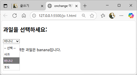 onchange 이벤트는 사용자가 , , 등의 값(value)을 변경했을 때 발생하는 이벤트입니다.즉, 값이 바뀌고 요소가 포커스를 잃었을 때 실행됩니다. (즉시 실행되는 oninput과는 다릅니다.)✅ 특징주로 입력값 확인, 폼 자동 처리, 선택값에 따른 UI 변경 등에 사용됩니다.예: 드롭다운에서 옵션을 바꾸면 해당 옵션에 따라 다른 내용을 표시하기.📌 예제: 드롭다운 선택 시 메시지 출력 과일을 선택하세요: -- 선택 -- 사과 바나나 포도 👉 드롭다운에서 과일을 선택하면 onchange 이벤트가 실행되어 문구가 바뀝니다.원하시면 제가 onchange와 oninput의 차이를 간단히 비교하는 예제도 만들어 드릴까요?