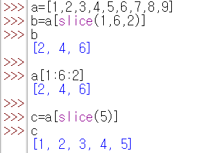 파이썬의 내장함수(Built-in Function)인 slice() 함수에 대해 알아봅니다. class slice(stop) class slice(start, stop, step=1) range(start, stop, step)로 지정된 인덱스 집합을 나타내는 슬라이스 개체를 반환합니다. start 인수의 기본값은 None이며, step의 기본값은 1입니다. 확장된 인덱싱 구문을 사용하는 경우에도 슬라이스 개체가 생성됩니다. 예: a[start:stop:step] 또는 a[start:strop, i]. 반복자(iterator. 이터레이터)를 반환하는 대체 버전은 itertools.islice()를 참고하십시오. >>> a=[1,2,3,4,5,6,7,8,9] >>> b=a[slice(1,6,2)] >>> ..
