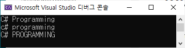 ToUpper() 모두 대문자로 변경된 문자열을 반환합니다. 원본 문자열을 바뀌지 않습니다. ToLower() 모두 소문자로 변경된 문자열을 반환합니다. 원본 문자열을 바뀌지 않습니다. 예제 static void Main(string[] args) { string s = "C# Programming"; string s1 = s.ToLower(); string s2 = s.ToUpper(); Console.WriteLine(s); Console.WriteLine(s1); Console.WriteLine(s2); } ToUpper() 메서드, ToLower() 메서드를 이용하면 대소문자 구분 없이 두 문자열을 비교하는데 사용될 수 있습니다. static void Main(string[] args) { str..